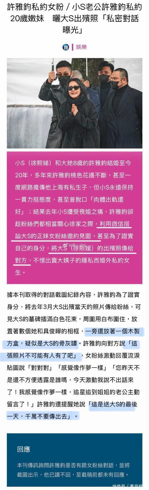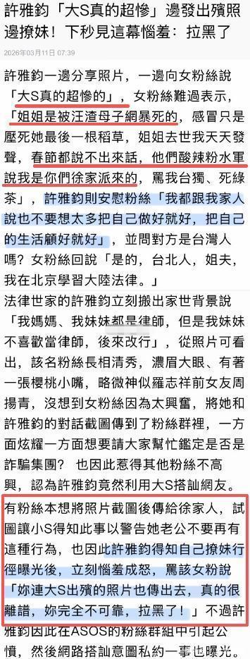 这段时间汪家和S家可真热闹,一家接着一家自曝家丑,真是将人性的贪婪和自私展现的淋漓尽致。 这边汪小菲和张兰还在直播里吵得不可开交,那边马筱梅又自曝租房内幕,豪宅去向成了未知数。 S家也没闲着,小S丈夫许雅钧被台媒曝出离谱事,彻底将一家人的体面撕了个粉碎。 怎么说汪家这么大的产业也勉强称得上豪门了吧,没想到马筱梅自曝现在住的房子是租的。 难怪一家人只要一有空就出来直播,就连刚生完宝宝的马女士都不闲着,月子没坐满呢就已经开始直播了。 可能是头胎恢复的比较快,她的状态看起来还是很不错的,面色红润没有太多因照顾宝宝疲惫的感觉。 在直播中她表示目前和孩子爸在台北信义区是租房住的,而且现在住的地方离大S两个孩子上学的地方都很近,上学的时候走几分钟就能到很方便。 说完这些才发现豪门也讲究性价比,不过也能理解一切都是为了孩子,这一点就能看出他们对孩子还是不错的。 不过很多网友也对此提出了疑问,大家都很好奇大S生前的豪宅在谁手里,按理说两家人都这么爱孩子应该给他们吧。 其实也不是不想给孩子们,原来在大S离世后这个豪宅还需要每个月还高额贷款,无论是菲总还是继父和小姨都没商量妥当,所以房子谁也没得到。 后来菲总也想着在孩子上学近的地方买个房子,没想到这个位置的房价都太高了。 可能也是菲总的眼光比较高,马女士透露菲总看上的那套房子价值约1亿元人民币。 面对这个价格菲总也是望而却步,说罢马女士还搞笑的模仿菲总听到价格后的举止动作,虽然没亲眼看到,但光是看她的模仿就已经能想象到当时的画面了。 现在再看感觉马女士也是真心爱菲总的,即使两人年龄差这么大,她也不嫌弃,不图对方的财产,只希望未来两人能走到最后。 其实汪家如今的日子要比S家好过很多,要不是菲总还跟个“巨婴”一样,相信他们的事业能更上一层楼,马女士也不用住在租的房子里了。 这些年张兰带着菲总打拼大家都有目共睹,奈何人家儿子根本不念着母亲的好,一有事儿就埋怨张女士。 近日菲总还不顾体面在直播间里说了很不尊重母亲的话,一时间引发了网友们的热议。 事情的起因是张女士很高兴自己又喜得了个小孙子,总是在网上分享小孙子的事情, 从什么时辰生的,再到长得怎么样,除此之外还在网上发了菲总如何体贴的喂孩子、拍奶嗝。 这些要是发生在普通家庭是多么温馨的一面,可在这个复杂的家庭就成了争吵的导火索。 因为菲总的转变,许多大S的粉丝冲到菲总的社交账号下留言,觉得她偏心当初都没对那两个孩子那么好。 菲总是个心思细腻的人,看到这些评论很是生气,觉得都是母亲张女士口无遮拦给自己造成了这么多麻烦。 于是拿出手机打开直播和网友们吐槽,他表示自己“真受不了”,母亲总是将这些事儿搬到台面上,一点也不尊重自己。 除此之外他还表示自己在私下已经跟母亲说了很多遍了,可就是不听还依旧我行我素。 可能是说到气头上了吧,菲总表示母亲在公司并没有股份,还狠心的要和母亲“割席”。 表示自己“姓汪”,反正话里话外就是很排斥外界总是将两人捆绑,总是叫他们“张兰母子”。 说白了就是又有“大男子主义”,还没太多实力,如果没有张女士也就没有他的今天,这么说话属实不太体面了。 要说不体面那S家比汪家还离谱,这不小S的老公许雅钧仅凭一个举动,彻底将一家人的体面撕碎。 近日台媒曝出了一件非常抓马的事情,没想到小S老公许雅钧会做出来这么离谱的事情。 其实很多人都知道小S的老公这些年有很多花边新闻,但在她的苦心经营下一家人依旧维持这表面的和谐。 可当曝出许先生为了“撩妹”将大S出殡的照片发给粉丝,彻底将体面撕了个粉碎。 在聊天记录里不难看出许先生很谄媚的模样,为了证实自己的身份,他还特地拿出葬礼当天未曝光的照片。 其实他也知道被曝光后对自己的影响不好,还特地叮嘱粉丝不要告诉其他人,但他没想到人家转手就发到了粉丝群。 事情曝光后许先生还恼羞成怒的回去找粉丝,怒斥人家是个不可靠的人,之后有媒体找他去求证他全程“已读不回”。 对于这件事网友很是生气,觉得他对逝者非常不尊重,不仅如此还消费逝者,这种行为实在是令人发指的地步。 其实也有很多人想要替他开脱,想着再离谱也不能做这么不着调的事吧,然而更多的网友则是表示如果事情是发生在他身上也就不足为奇了,足以见得他的名声是多么的糟糕。 最后希望小S好好处理好自己家里的事情,眼瞅着要复出了,想必又要耽误一段时间了。